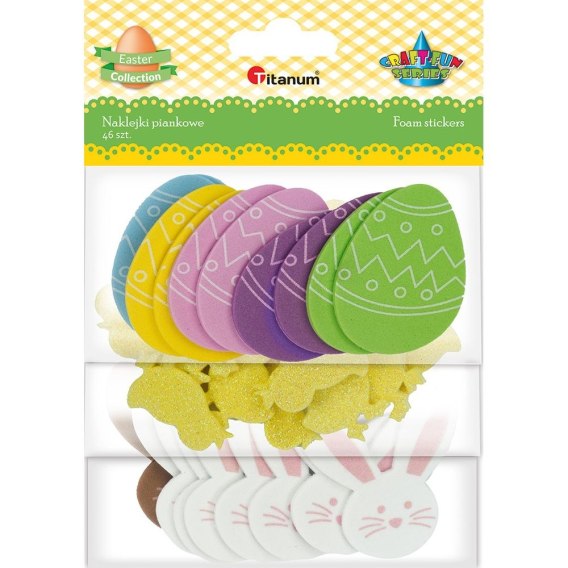 Naklejki dekoracyjne wykonane z pianki, dzięki czemu są wypukłe. Wzór: głowa królika 45x45mm (2 kolory x 8 szt.), kurczaczki 30x33mm (20 x żółte brokatowe), pisanki 30x33mm (2 kolory x 8 szt.). Blister 46 szt.